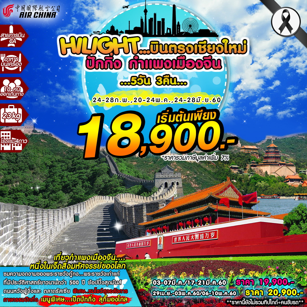 - น้ำหนักสัมภาระท่านละไม่เกิน23กิโลกรัม,ค่าประกันวินาศภัยเครื่องบินตามเงื่อนไขของแต่ละสายการบินที่มีการเรียกเก็บหมายเหตุ: สายการบินแอร์ไชน่า CA ให้กระเป๋าสัมภาระที่โหลดใต้ท้องเครื่องได้ท่านละ1ใบมีน้ำหนักไม่เกิน23กิโลกรัมและขนาดของกระเป๋าต้องมีขนาดโดยรอบของกระเป๋ารวมแล้วไม่เกิน158เซนติเมตร (กว้าง+ยาว+สูง) สัมภาระติดตัวขึ้นเครื่องได้ท่านละ1ชิ้นน้ำหนักต้องไม่เกิน7กิโลกรัมถ้าน้ำหนักและขนาดของกระเป๋าสัมภาระเกินกว่าที่สายการบินกำหนดไว้จะต้องเสียส่วนที่เกินเป็นจำนวนเงิน200 USD หรือ1,300หยวนต่อใบ